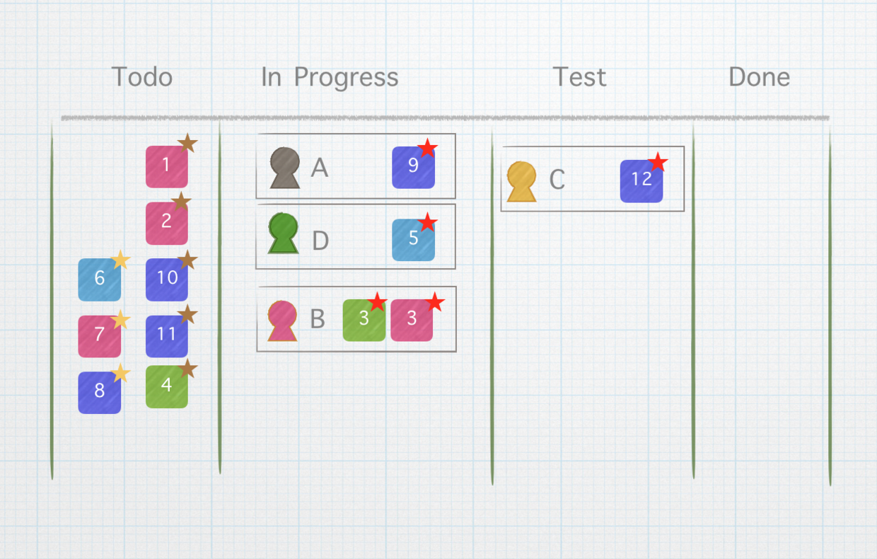 - 站会的第3天,人员B还在做_#3_卡,我们其他成员可以加快速度做其它卡以弥补人员B的慢速度,同时项目经理也可以更早的介入这个可能延期的卡中帮助人员B