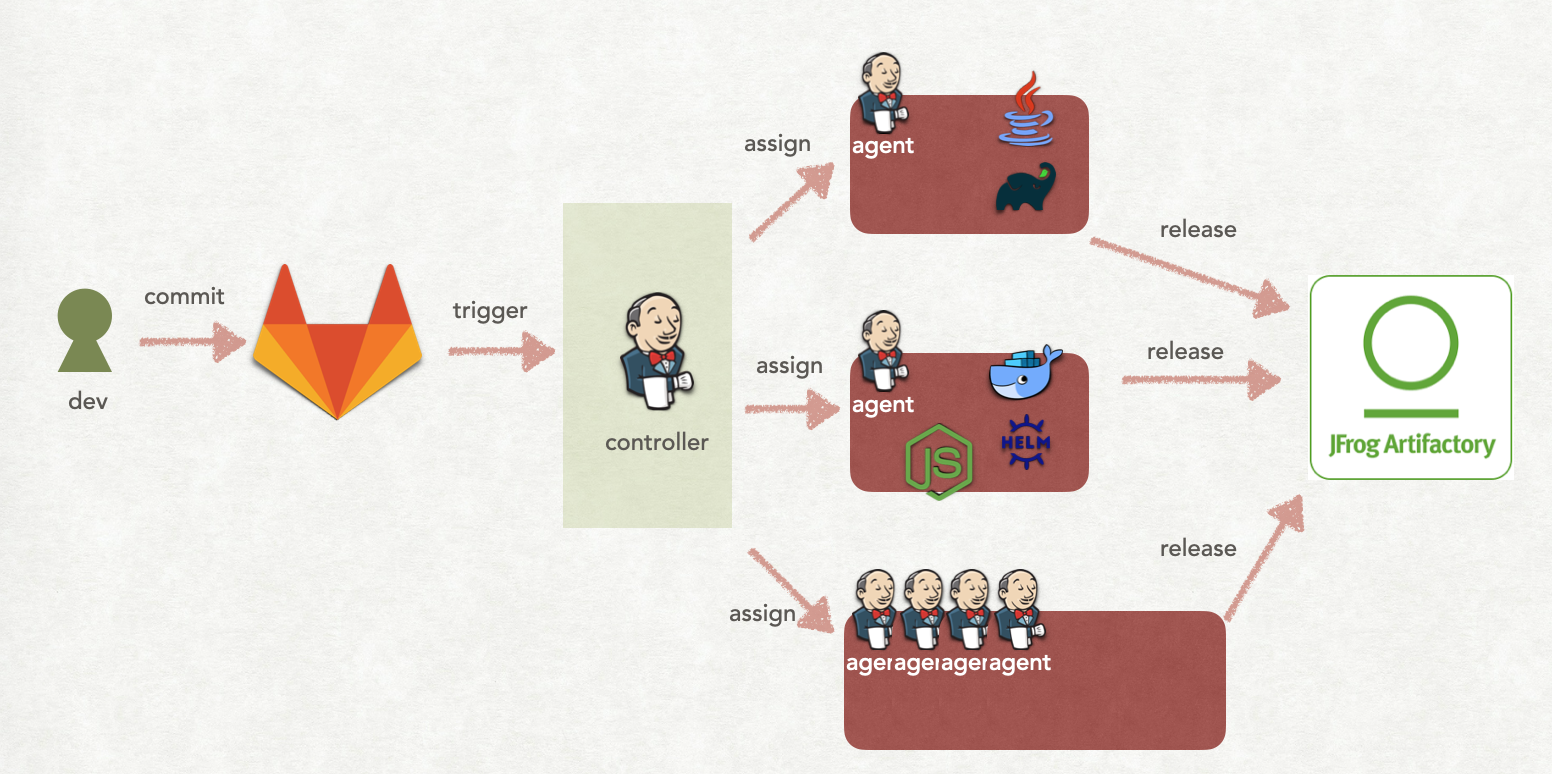 - Gitlab检测到开发人员提交代码,然后触发Jenkins controller执行;