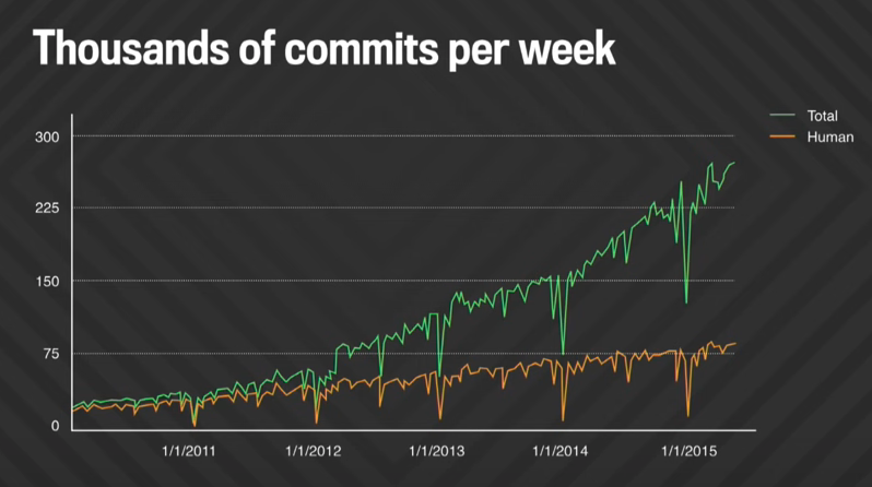 希望以下案例可以给你一个感性的认知。下图是Google在2010年到2015年的周commit数量。绿线代表commit总数,黄线是人数。我们取离我们最近的2015年的数据来讨论。2015年的代码量如下: